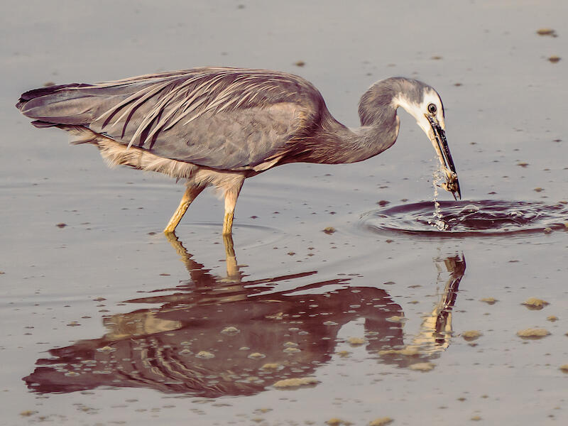 Well composed print of the kotuku. I like how you have captured the sun on the water drops. I would recommend trying to lighten the shadows in the rocks to give them more detail. Nicely presented.