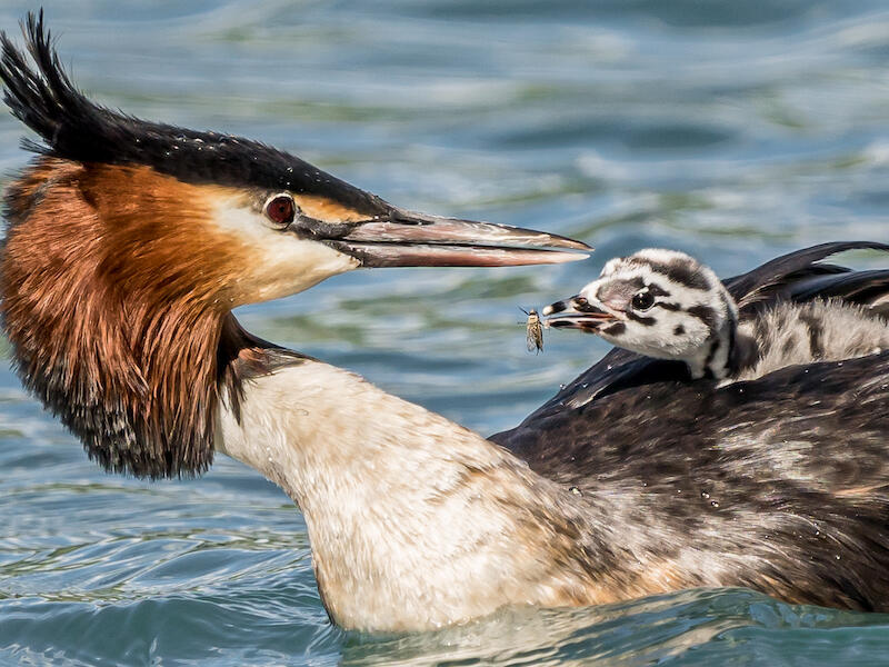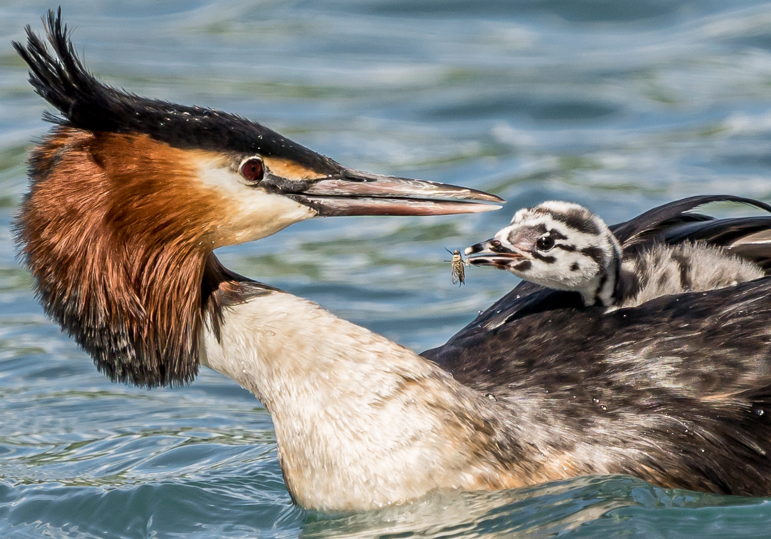 Just beautiful. The story of the Grebes is shown well. We can see the chick, adults and where they live, what they feed on. The birds are sharp and there is good textures in the feathers.