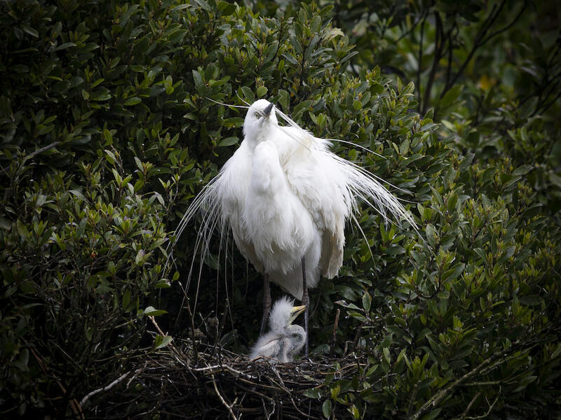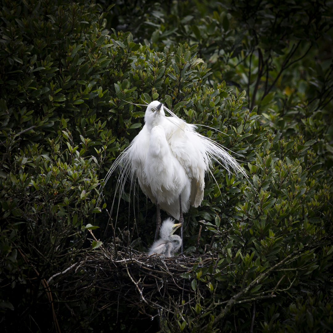Preening Eastern Great Egret & Chick - Kotuku - Ardea Modesto Honours