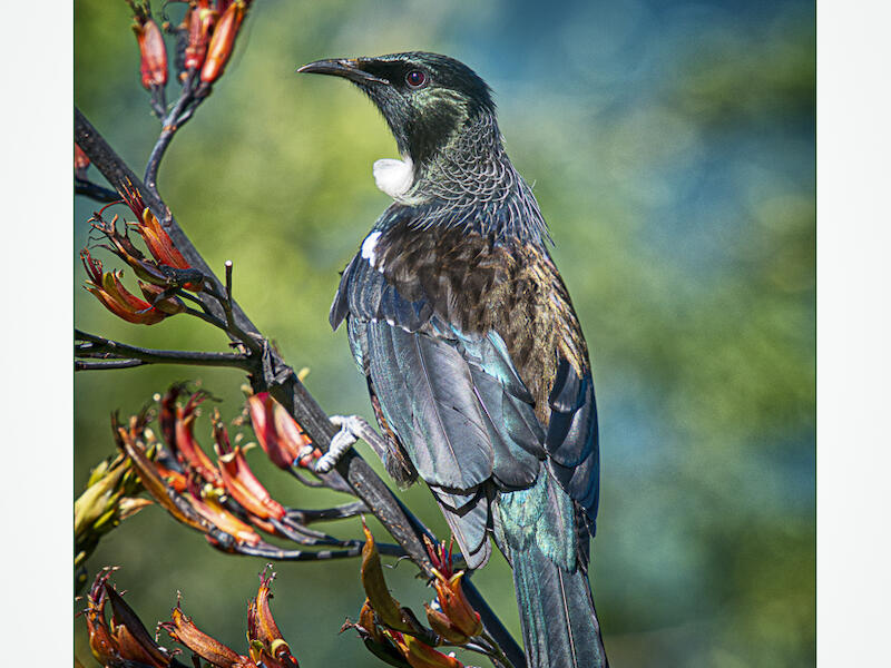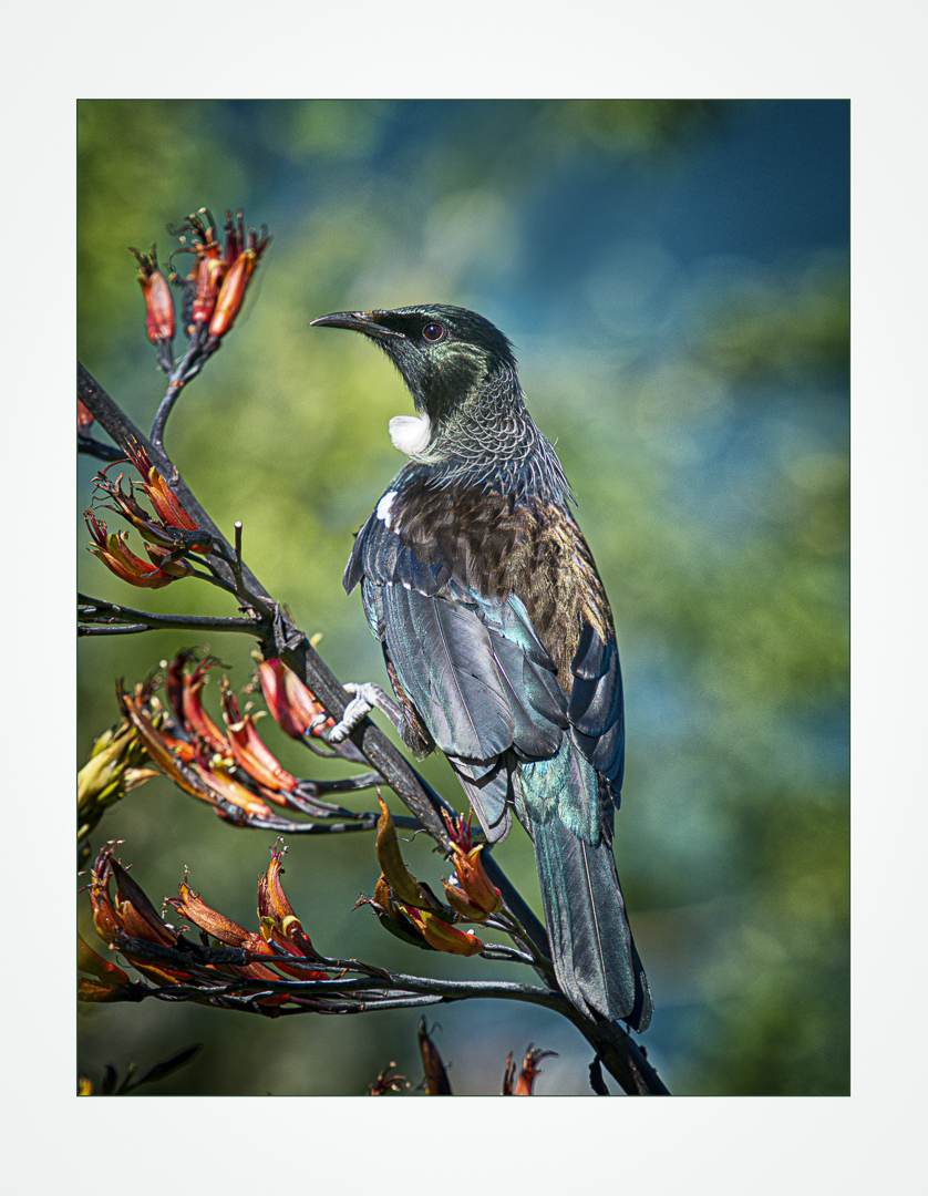 An excellent example of our native tui in the sun, showing the irridesence of the feathers at their best. I like the soft bokeh background and how it reflects the colours of the tui as well. Great feather detail and good catchlight. I would have loved to see this image matted as I think it would show it off even better.