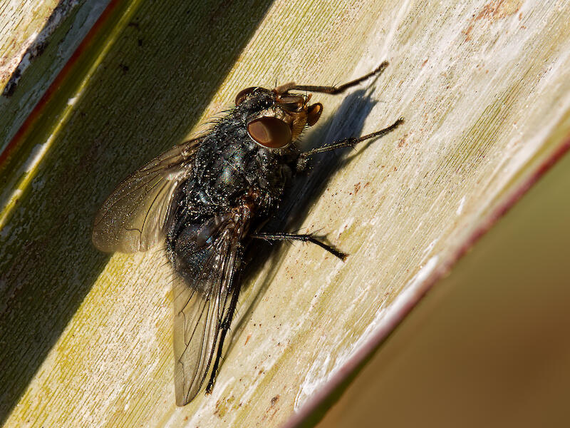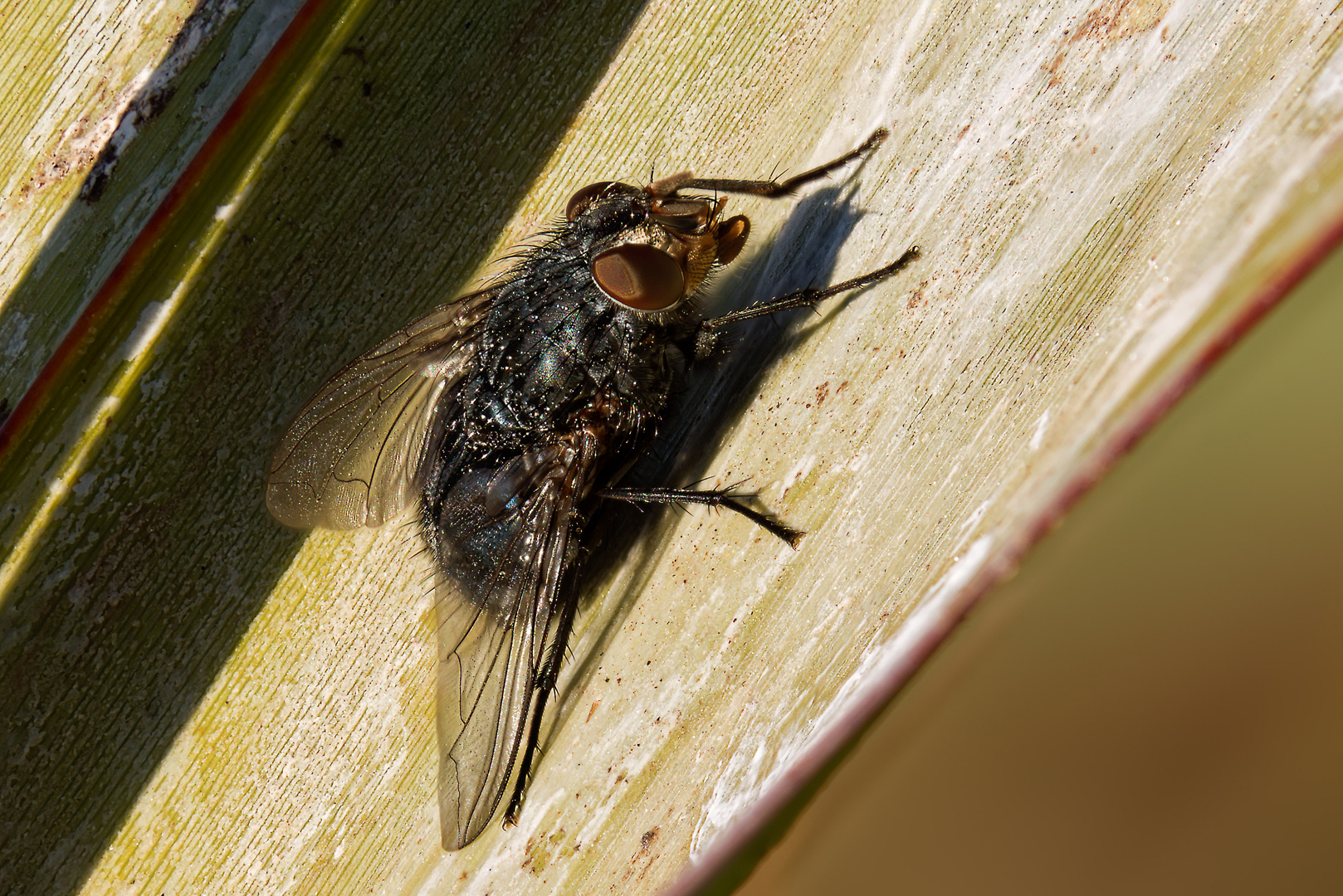 This is a reasonable depiction of the fly. The sharpness is very good. The sunny day has made it difficult to get more detail in the blacks and the leaves are very bright.