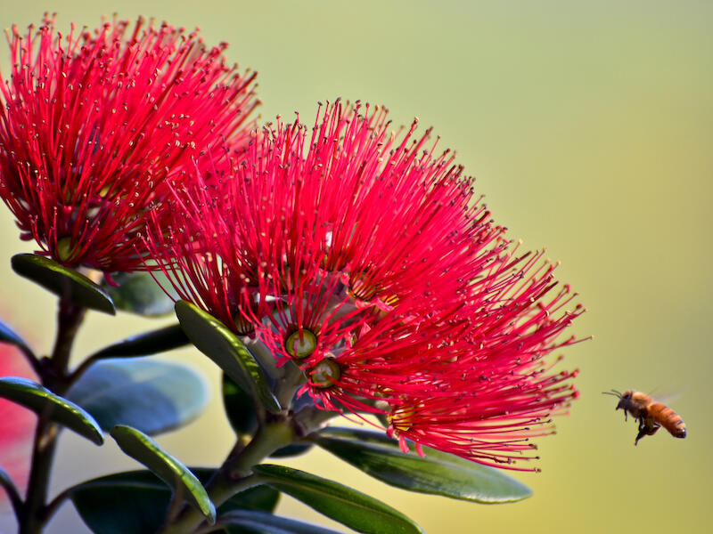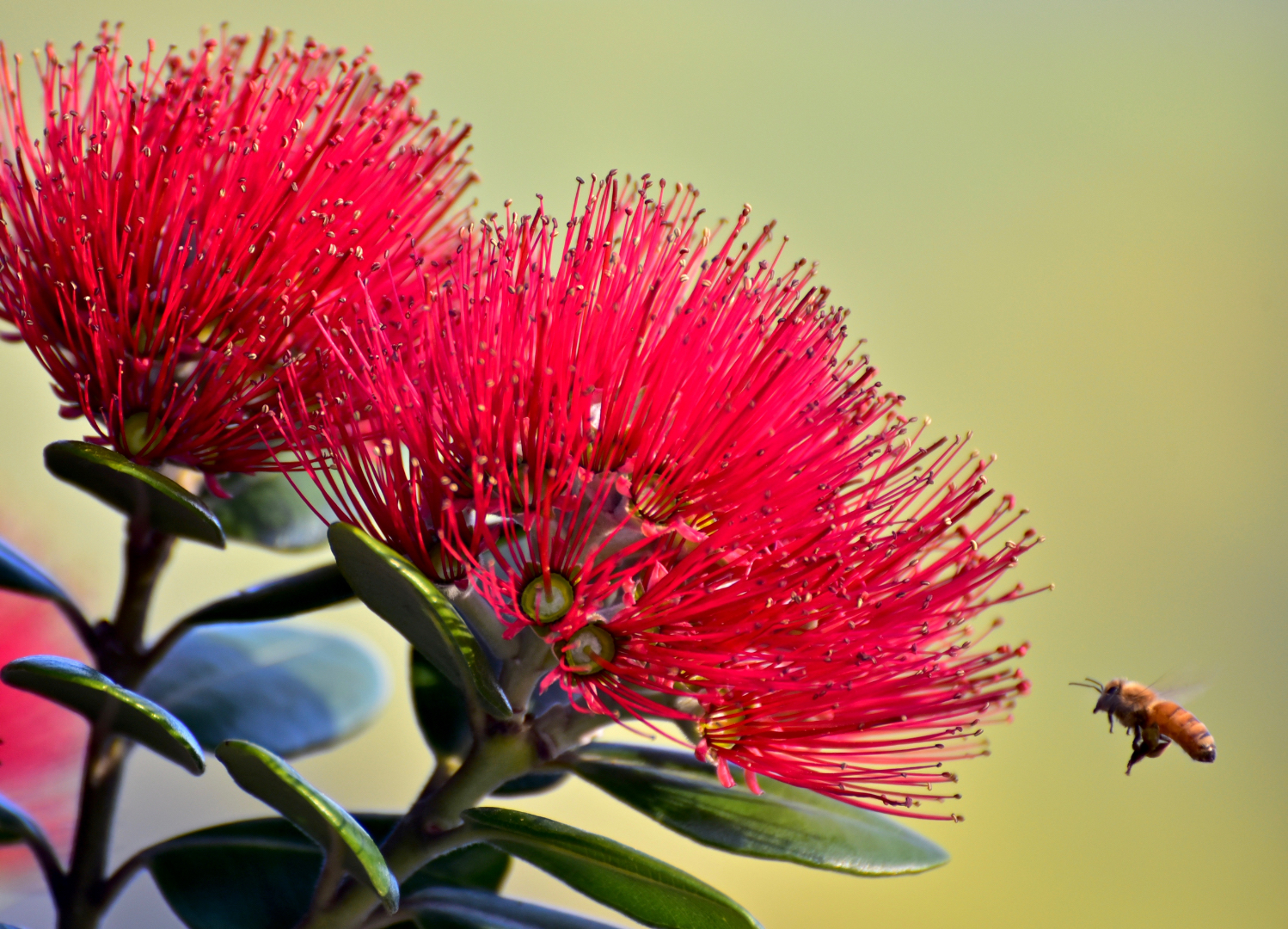The little bee certainly has some work ahead of him with these pohutukawa flowers. Nicely composed with the diagonal line through the image from the bee to the top left flower. Good detail and well presented.