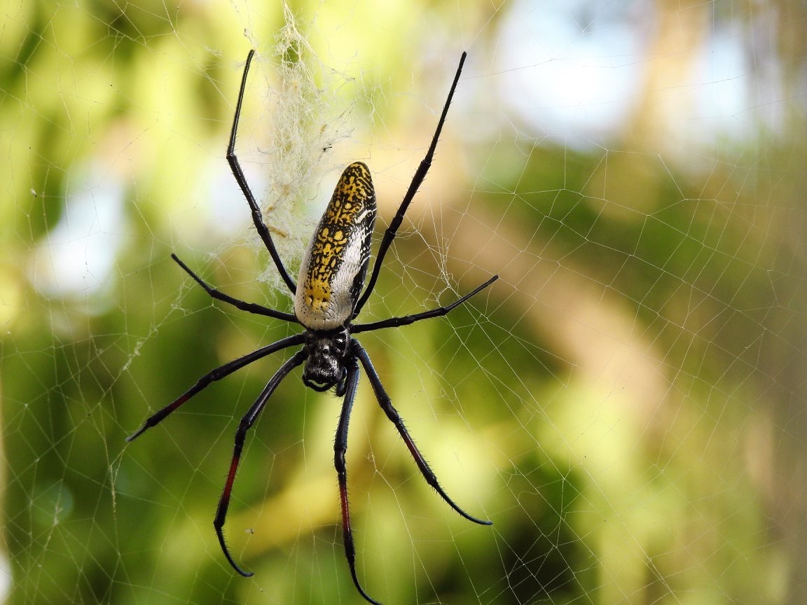 The spider is nice and sharp. The colours are well portrayed. It is a pity that the lower leg has been cut off. The highlights in the background are distracting. It is good that we can see the type of web it makes.