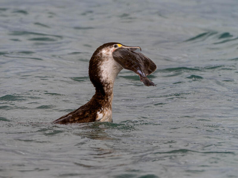Pied Shag with Flounder. It never ceases to amaze me how the birds can actually eat this thing. The fish looks huge in its mouth, and, you've captured something interesting about what's going on. The bird has obviously just come back from underwater with the fish, unfortunately in the wrong place at the wrong time. Very static presentation is the only observation I've made here, right smack in the middle of the frame. Which has created a static visual representation of what is probably a fairly dynamic moment.