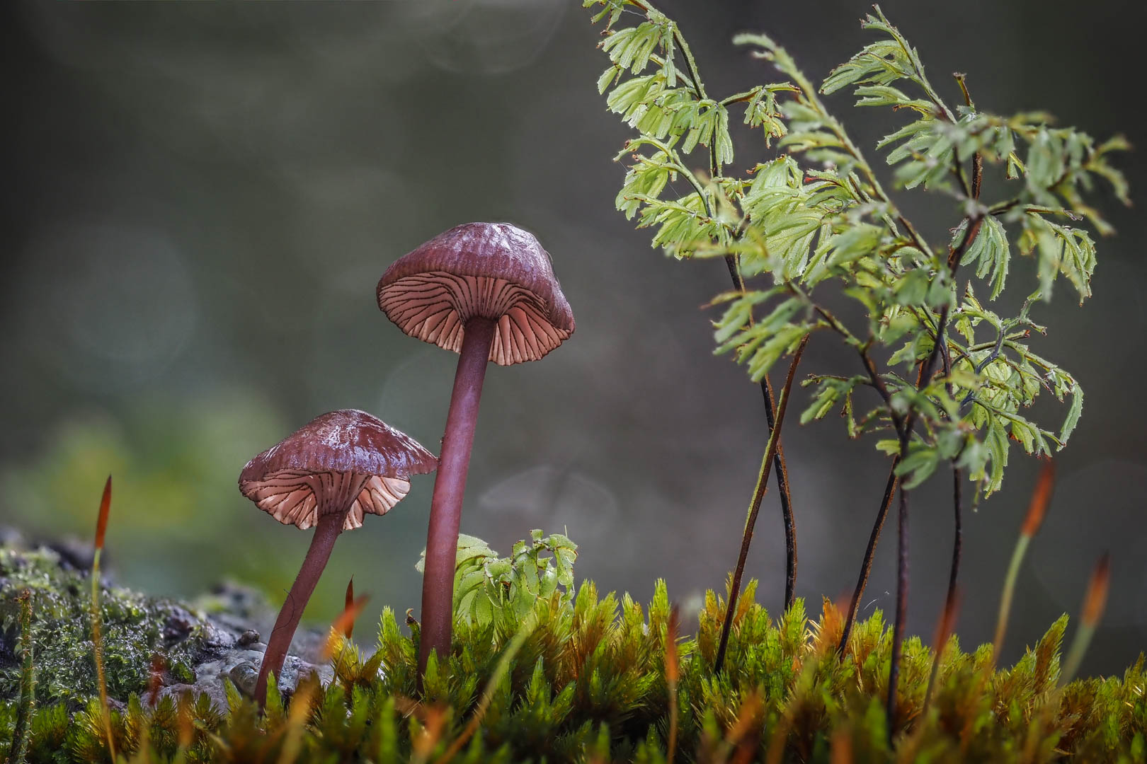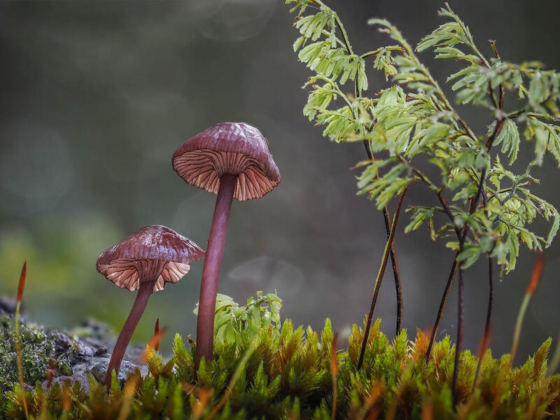 Mycena Lividorubra. This one you didn't give me an English option of cute little purple fungi. It's going to be a Mycenta liverdorubra. Anyway well put together, well done, carefully constructed, nicely in focus along the little lines of the bushy undergrowth that the little fungi are growing in. We can see under the gills, which I think fungi people like, and we can see some context of where it is. The out of focus bokeh in the background kind of works. Where it gets let down is at the top of the frame where you've cropped into that little bit of greenery and you've created a point of tension that you didn't intend. Because it's on the edge of the frame, the bottom, look at the fungi and then I glow up to the top of the frame where you've chopped off that little piece of greenery. So just that subtle element, move the camera back just a little bit or clip the top of it off or, or whatever, but you just need an edge patrol happening to really step this up to the next level. But it is a gorgeous image.