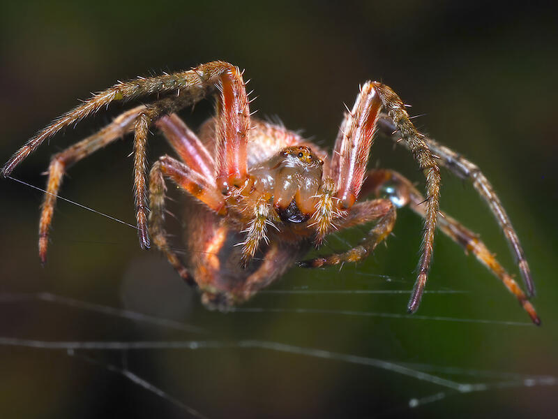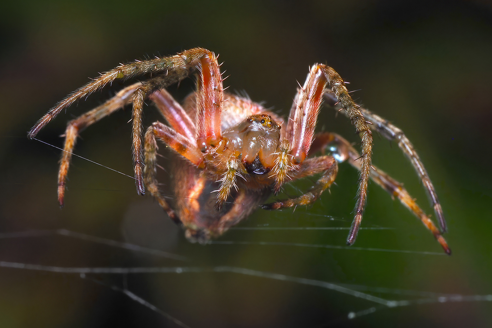 Zealaranea trinotata - Hmm, big spider. Well put together and really dramatic image of this big spider. We can see that he's sitting on a web and we can see that it's in a sort of a forested environment by just by the colours of the background. You've got a really micro thin, depth of field which is caused by the macro, essentially it's the nature of the beast with macro, isn't it? In the perfect world, the plane of focus would be just a little bit further back to really pop the eye of the spider itself and make that the strongest element, but I just do love that. The little line that comes from its front leg and just the details and grittiness of the actual bits that are strongly in focus. And that's all given context to by the background, which I can see the whole spider. So you've presented this really well.