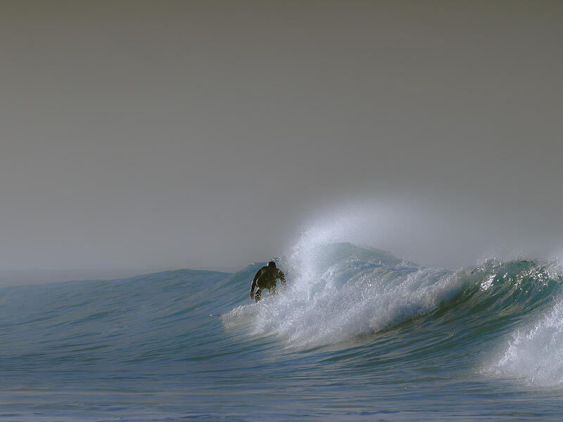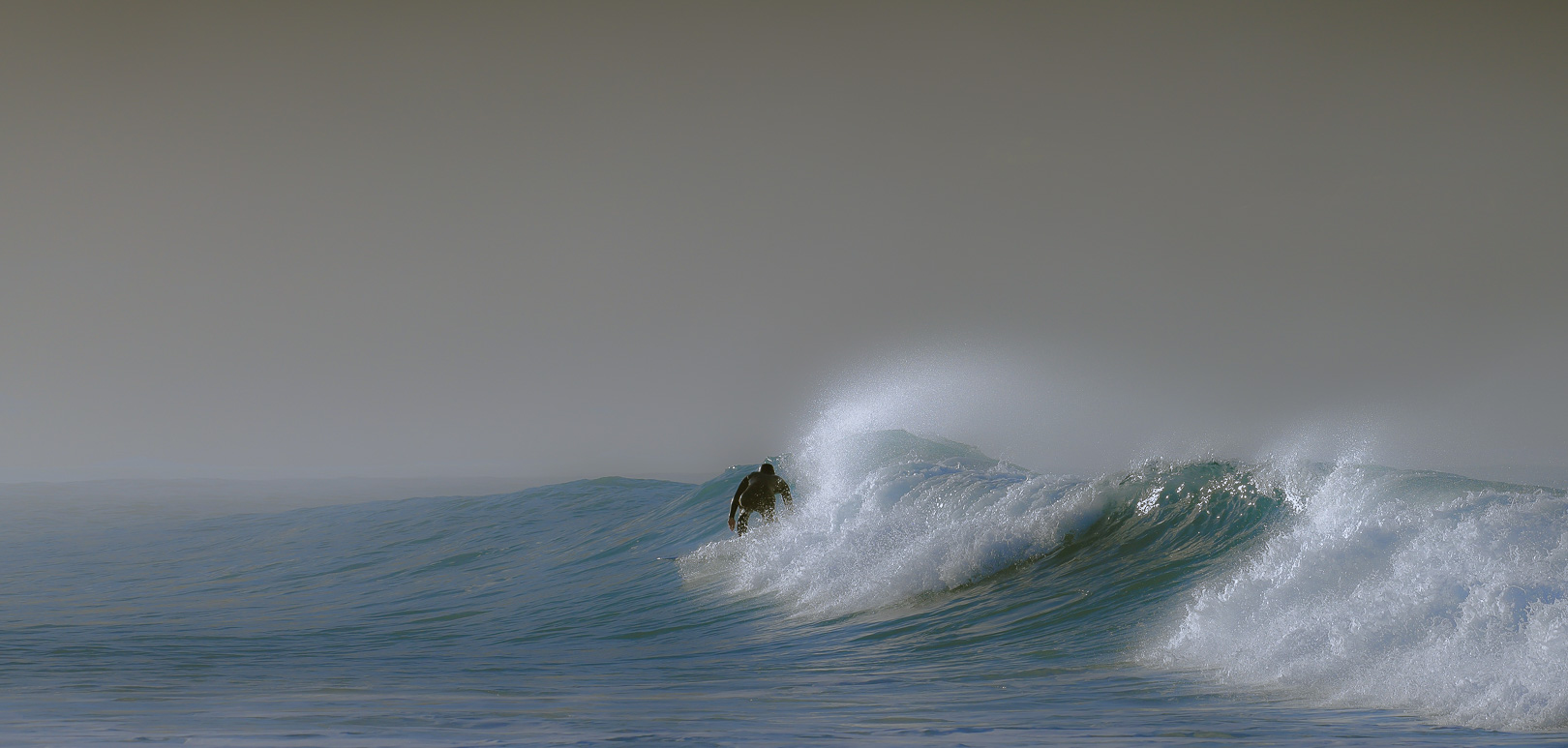 Beautiful Surf. I enjoyed the wide landscape sort of crop that works and is it appropriate for this situation you've presented this with a kind of a soft ethereal negative clarity kind of feel about it, which I think works really well in the wispiness and it works well in the background, but it seems less valid when applied to the waves. I also get the sense that the primary focus point is on the closer gap to us in the waves, than the actual surfer, who is the sort of key point. And it's also a little bit disappointing that the surf is facing away, so they become more abstract. Also the position of the surfer pretty much bangs back in the middle of the frame. There's also a fairly static presentation for what is a clearly moving object.