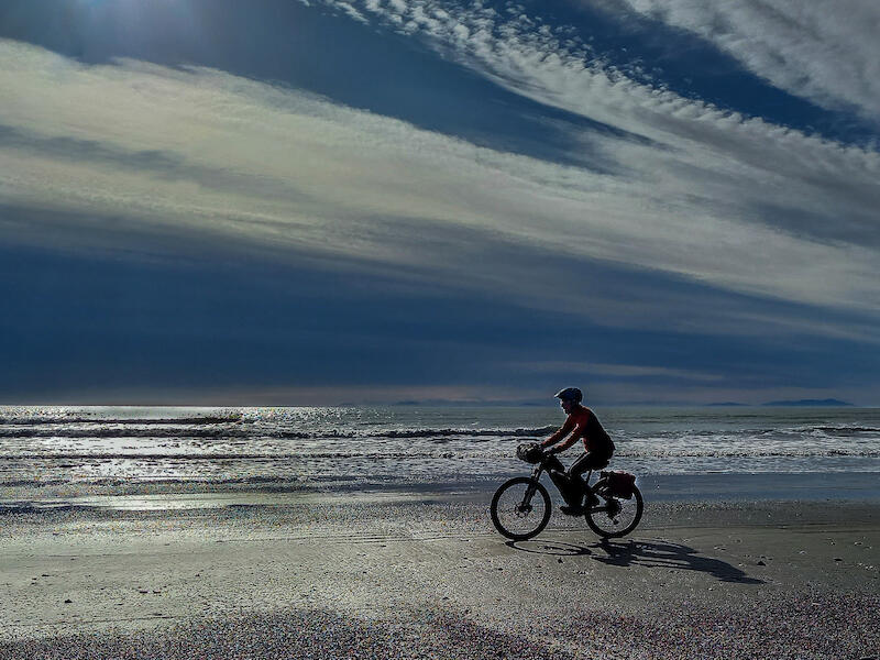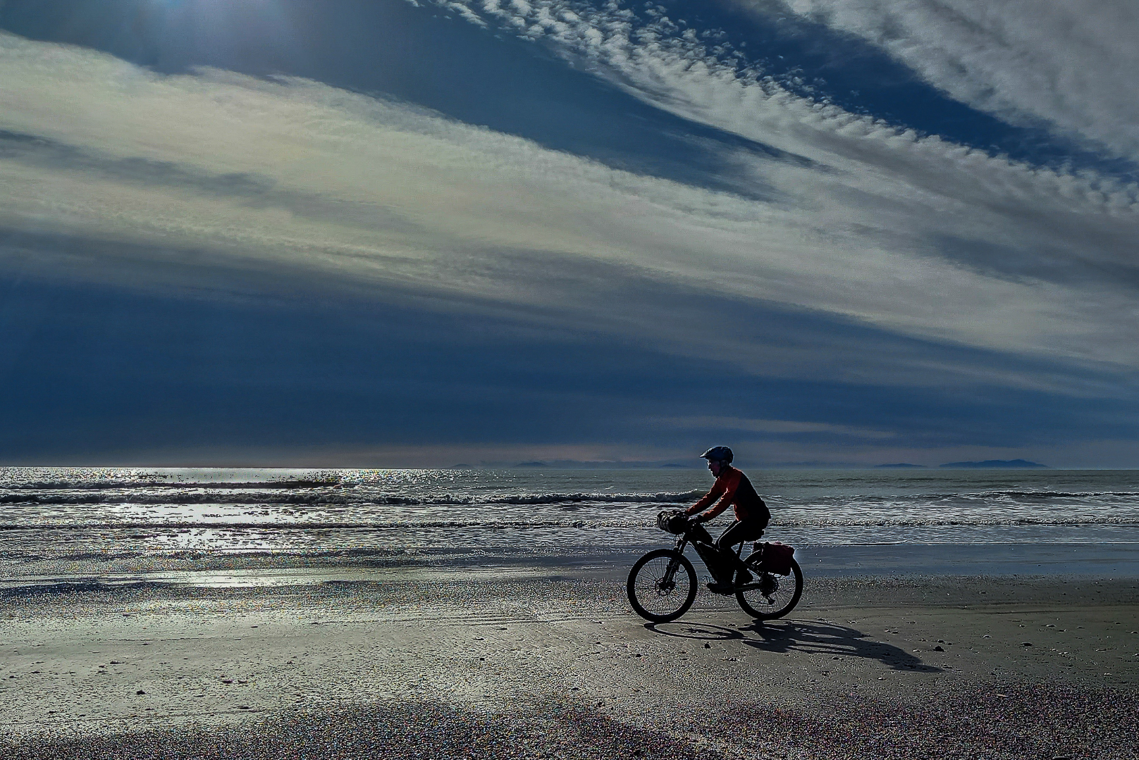 Enlightened. Is a cool picture of a guy biking along the beach with the. With a bit of gear on his bike, so I suspect he's going somewhere, or been somewhere, or a bit of both. Enlightened element I think comes from the fact that there's a little bit of rim light as the sun in the background has created that rim light and the interesting pattern. I think where all the action is in the bike and the shadow. That's enough in itself, and in fact it's relatively small in the picture space. I do think a close up version of this would more strongly represent the story you're trying to tell.