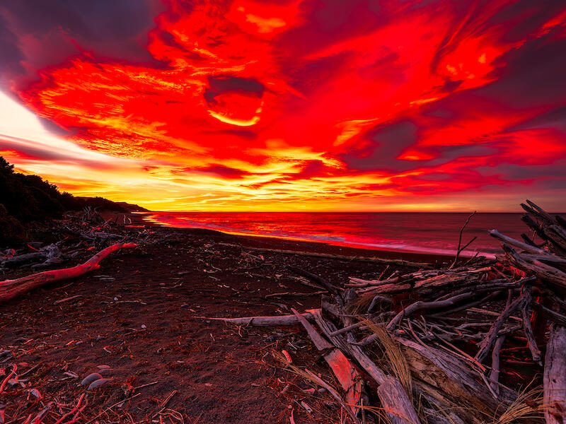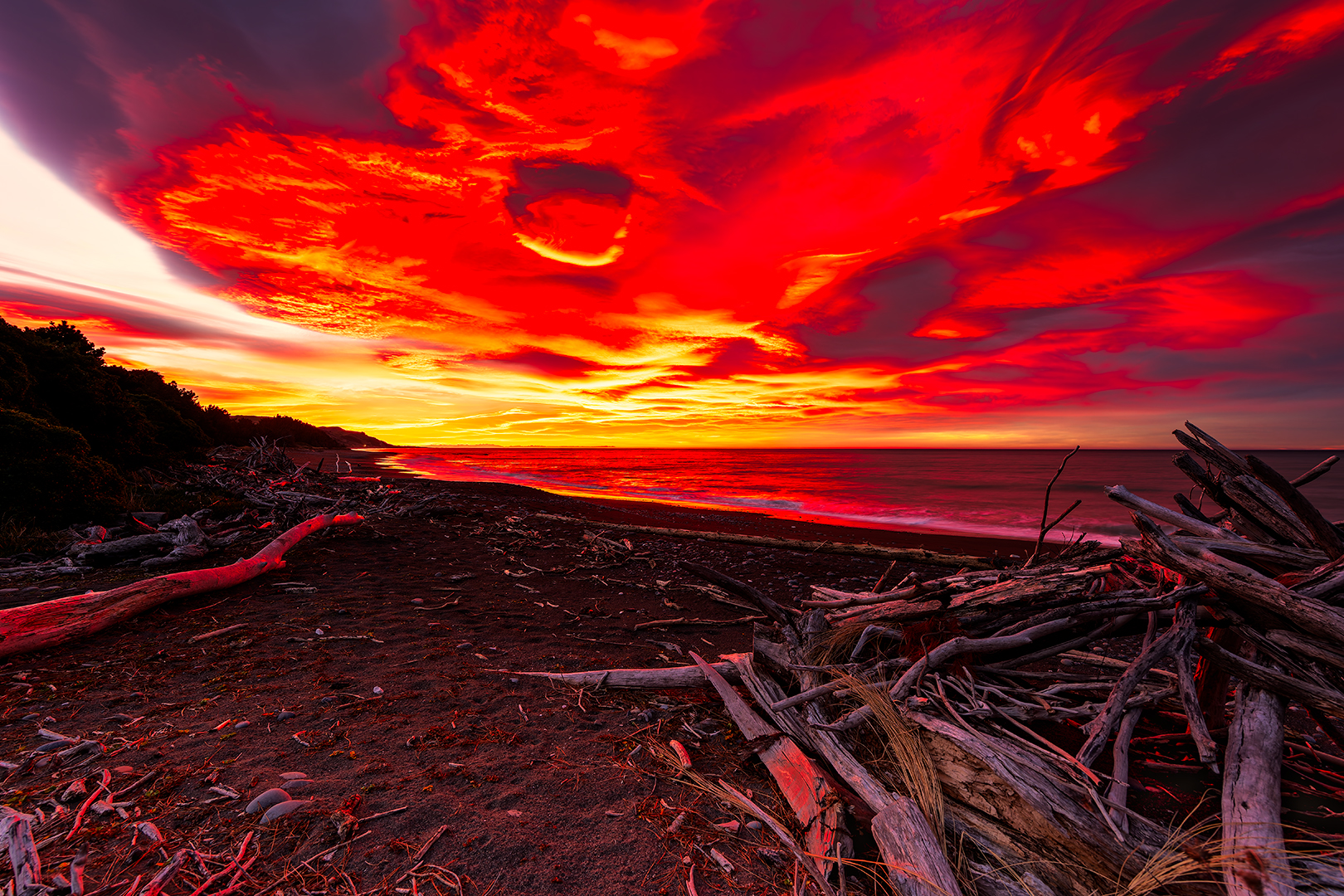 Scarlet Dawn. It's kind of wow moment. It must've been absolutely fantastic to kind of see that there. It's clear that the reds are showing all the way through because we can distinctly see red reflected on the driftwood in the foreground and it's pretty much everywhere. But it's so red that it's overpowering visually and, I do kind of sense that the saturation slider might have been pushed a little bit far, but no doubt it was dramatic and it did feel dramatic.