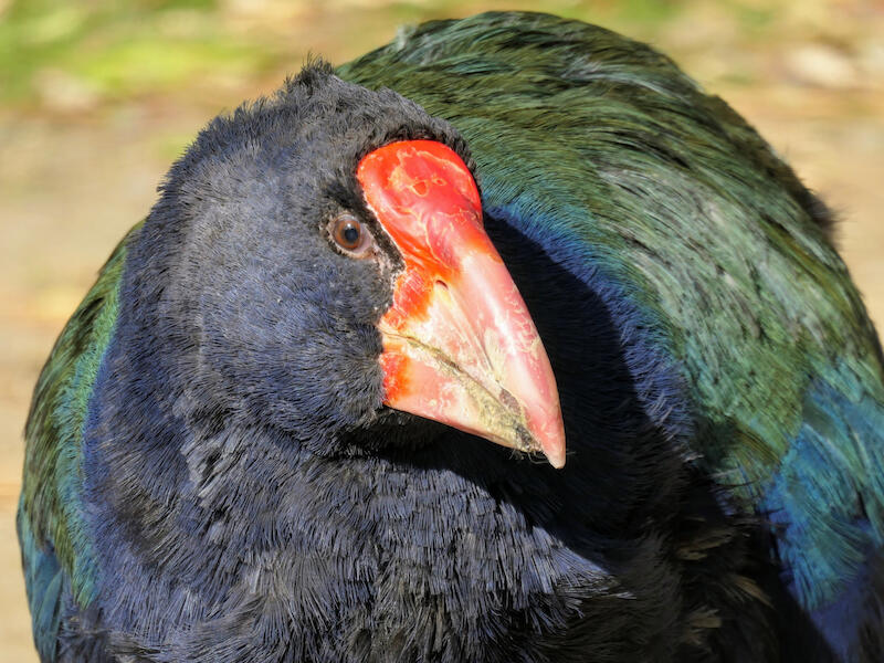 Tākahē is a big explosion of colour and the interest in this bird is in the colour and the blues and the greens and all that sort of stuff. Plus the bright red exclamation mark of that solid looking beak. The background's out of focus in works. The focal point is probably a little bit behind the bird's eye so it's not as crisp around the eye as it would be in the perfect world. And you can see the feathers on its chest are strongly in focus, where the beak and the eyes, which are probably the visually stronger element, are somewhat soft.