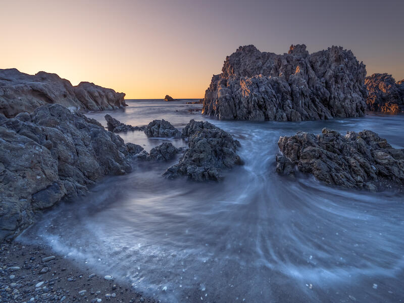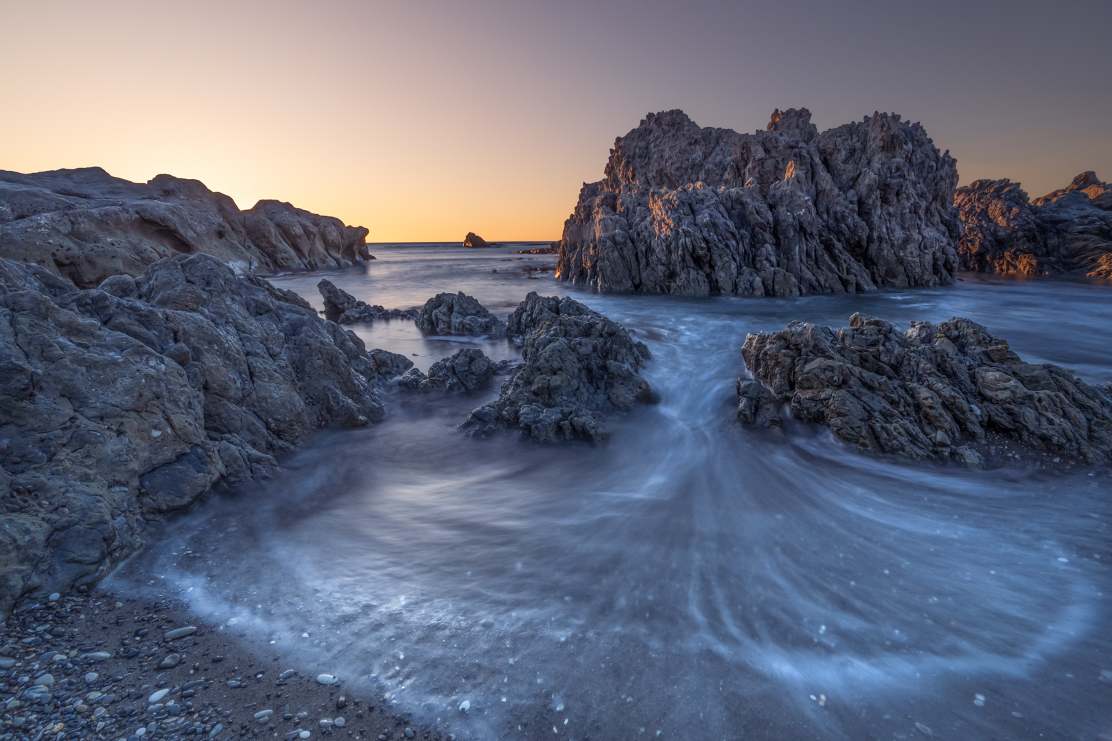 Ward Beach. Beautifully presented, soft silky water, and nicely captured rocky outcrops. My eye is drawn through the frame. With the silky water pulling me up through the little gap and then I go around to the left of that strong crop and then I disappear off to the distance and in the distance is a little rock which is nicely lit. And creates a focus point on the horizon. So I like the journey that you take me on this, and with this. And the balance that you've created between the highlights in the in the rocks in the foreground and on the little spots within the rocks and the warmth and the sunset in the distance works really well.