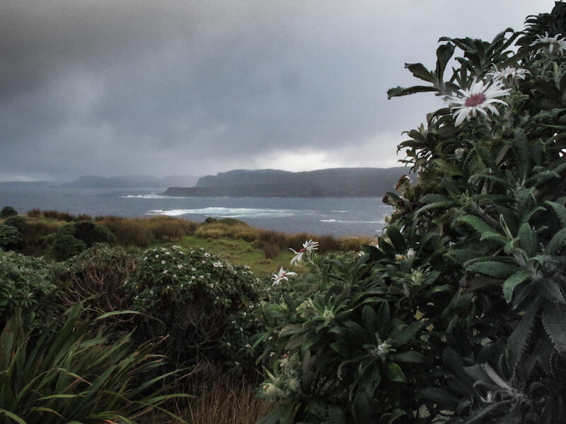 Moody Coast. And you've chosen to frame the Moody Coast with the foreground flowers, which I think is a technique which has worked really well, it gives some depth to the presentation and draws us in as we come across towards the other side. If you're drawing us through, you're not drawing us to anywhere strongly enough. The cliffs on the far side are sort of they're moody in that they're hidden in the rain clouds effectively and the whole thing's a bit soft. The other thing that's happening here is the print itself is a little bit muddy in terms of its presentation and lacking in punch and a little bit dark. So I suspect if it was brighter, and the contrast was increased. I think that that would outline that closest headland more strongly. And that would more effectively produce what you're trying to show us.
