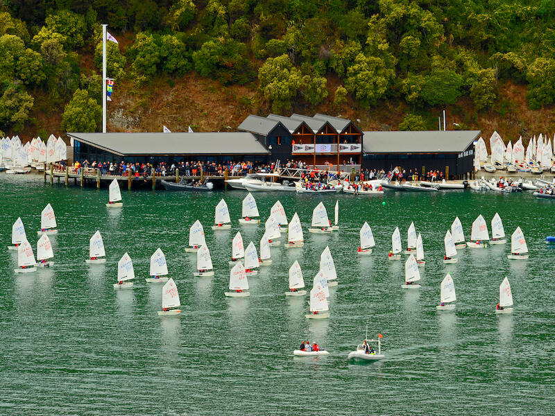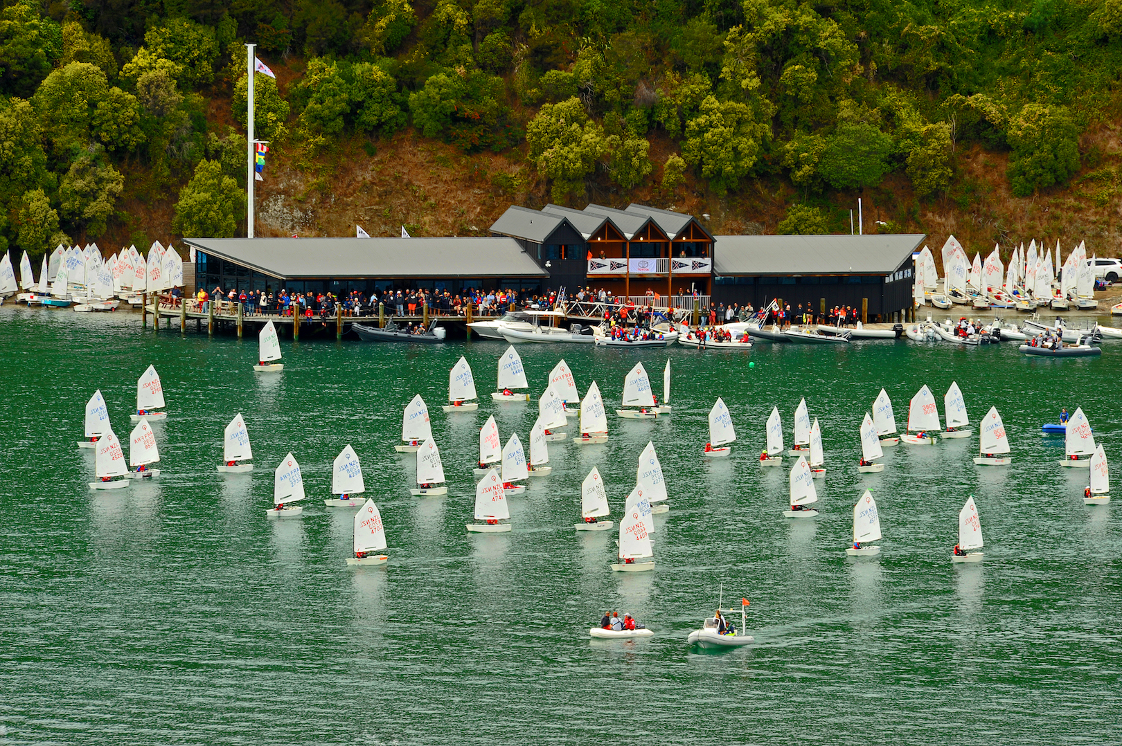 The Big Little Race! Is a wide view of a huge optimist fleet, so it must be at the nationals or some sort of championship of some sort, and there's clearly a bunch of chase boats and support people there all cheering on and you know, it's about the action. That works really well, and you've given a superb overview of the situation. In terms of the individual elements of energy, that's a bit lacking. I think you could see in a sort of a tighter composition, if you saw a few boats sort of duelling with each other, you would get a better representation of the energy. But that's not what you're presenting. You're telling us about the whole thing. And I think you've handled that really well, And you do show us the wide range and the huge numbers of boats that are here today.