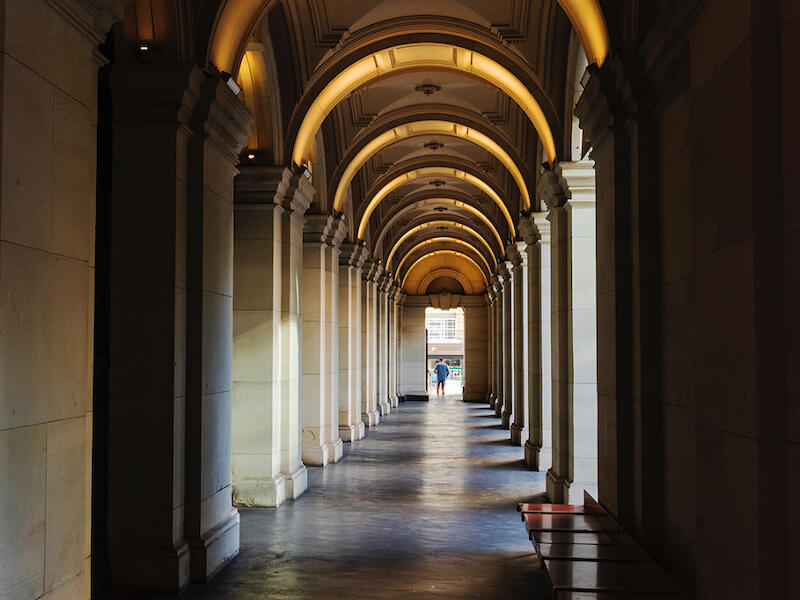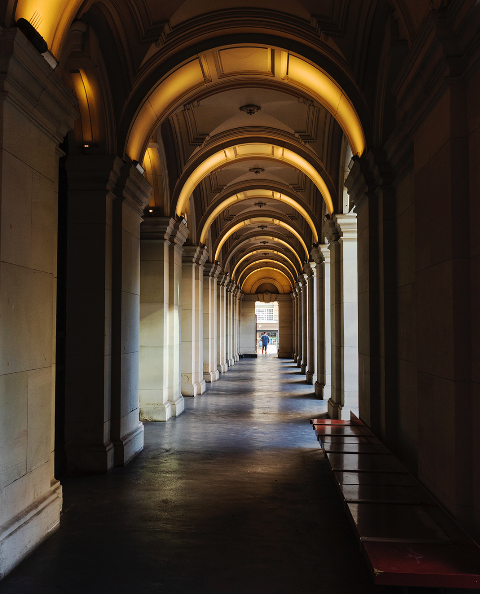 I like the interplay between light and dark in this image. The light and dark on the right side pillars help lead the viewer to the doorway at the end.