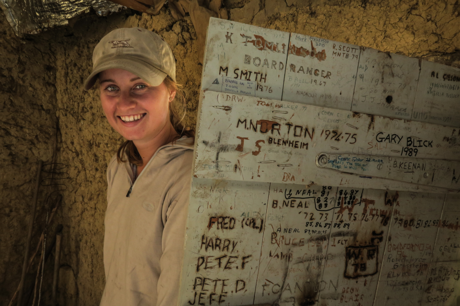 The idea is good here! The woman is linked to the door (?) where past occupants have carved their names.