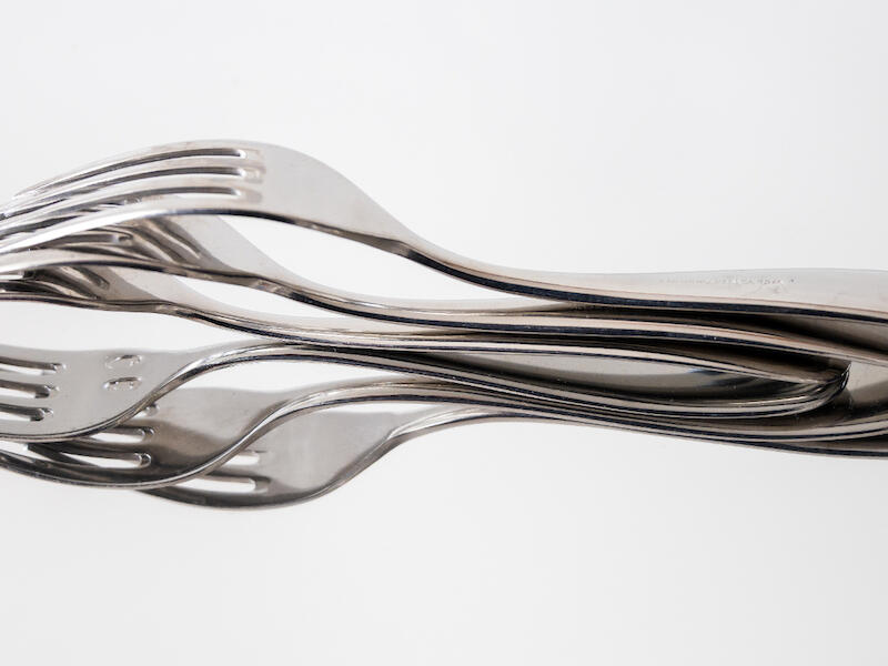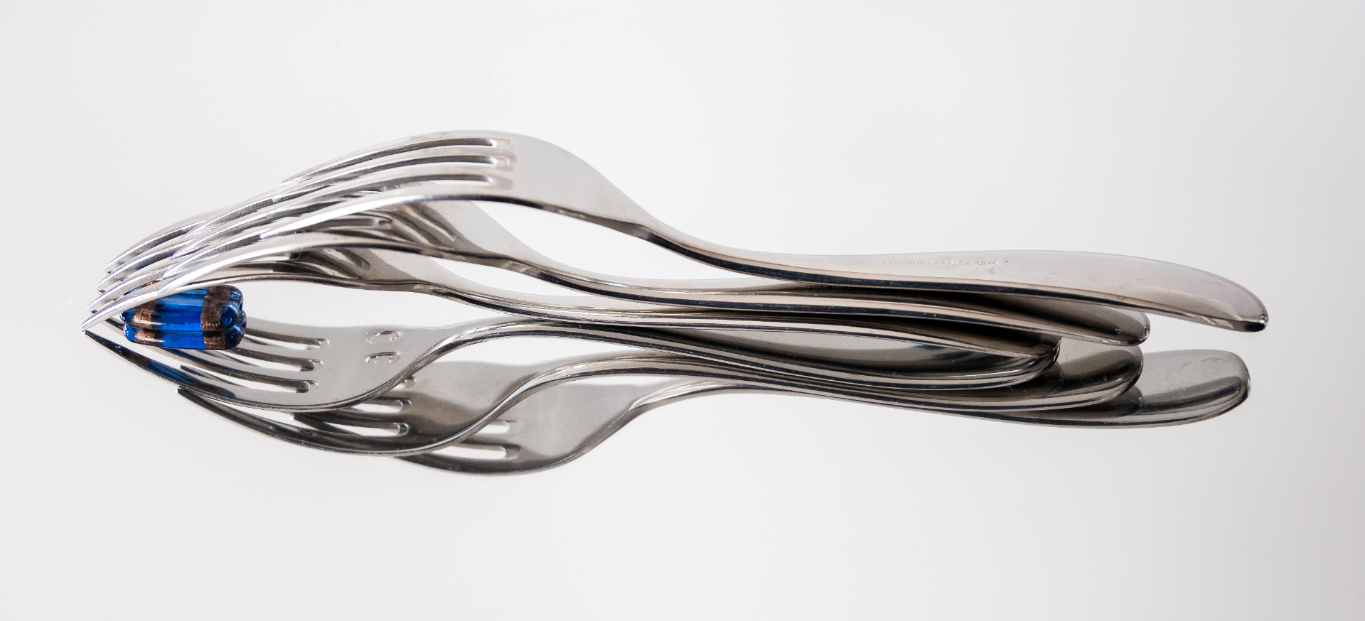 The thing that I find odd here is the blue object between the forks. The blue makes it stand out against the silver of the rest of the subject, which makes it stand out and attracts the viewer away from the main subject. Maybe if you had desaturated it, it wouldn’t be so obvious.
