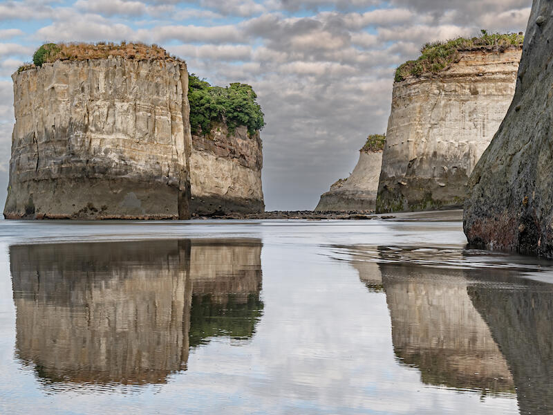 The light is relatively soft, which helps reveal the texture in the sea stacks.