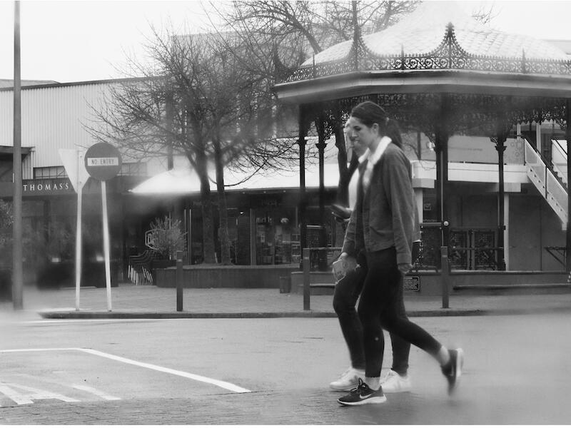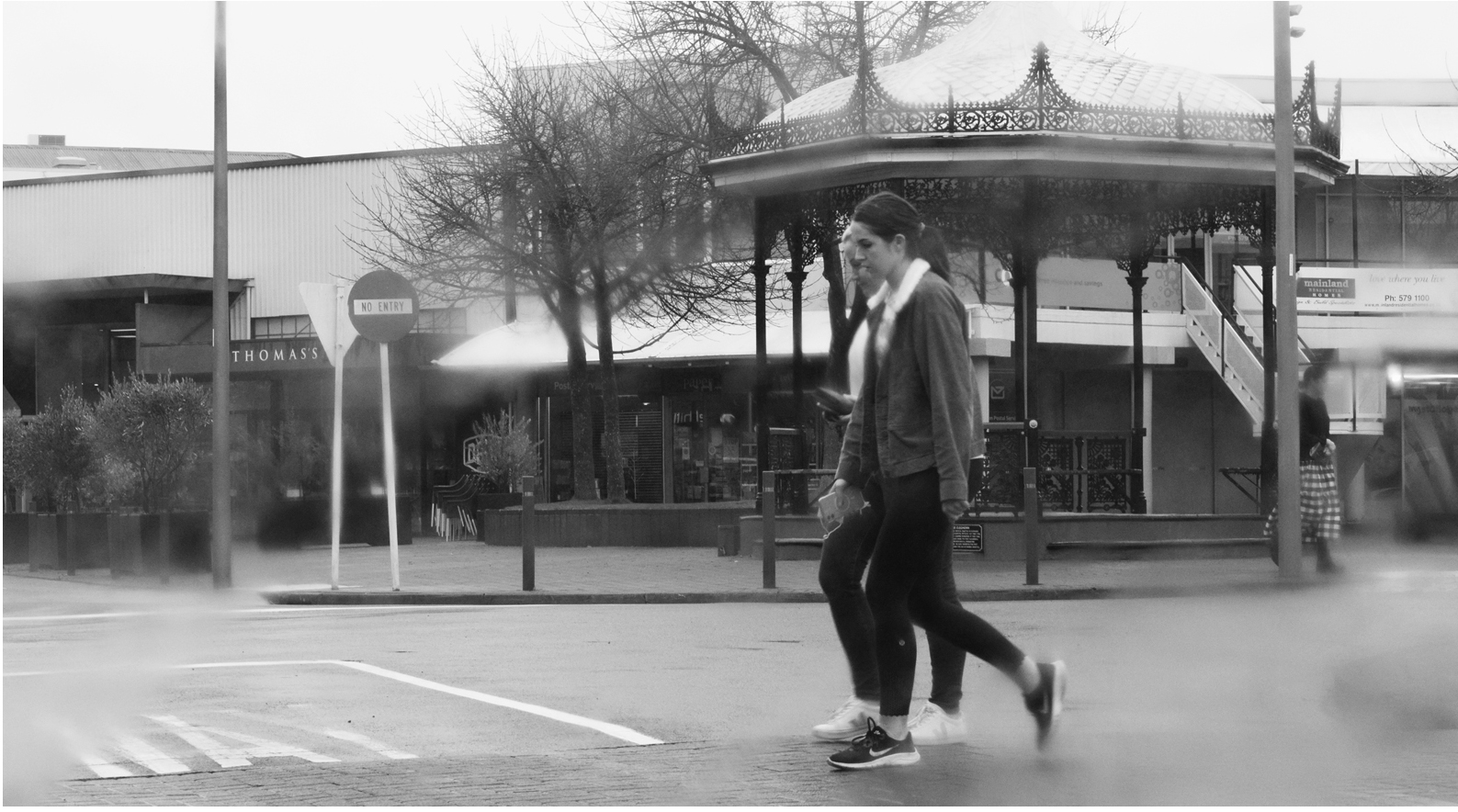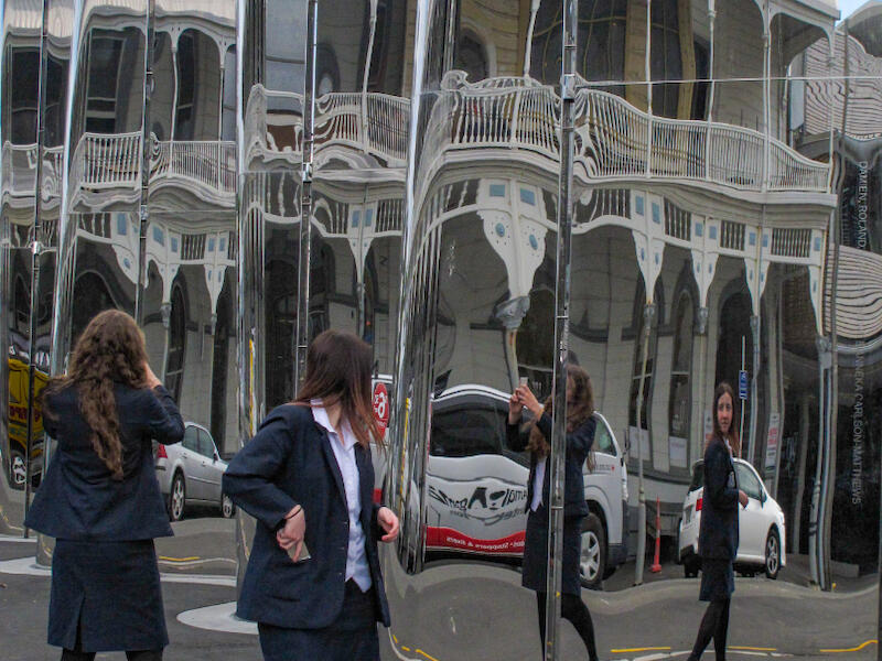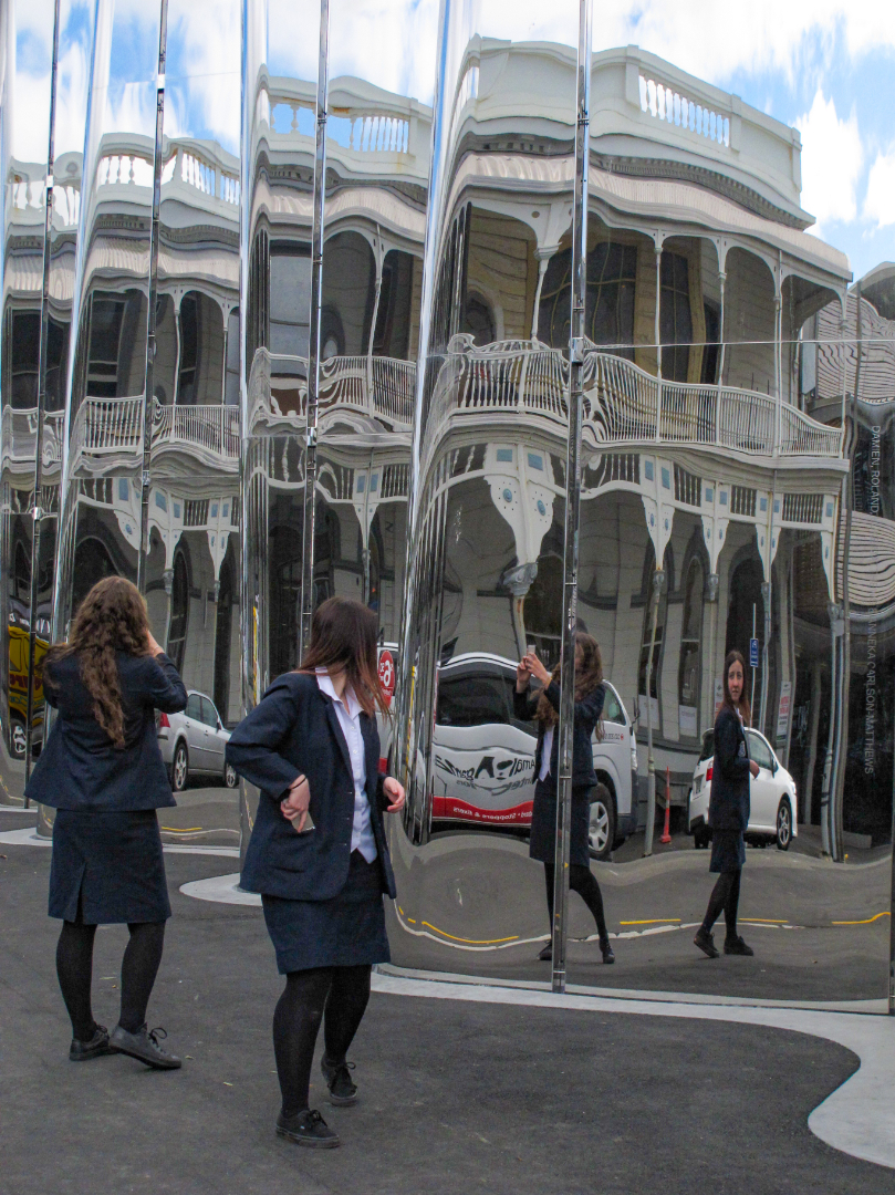 | A | Selfies | merit | The playful aspect of this image is quite engaging. The viewer’s eye is drawn from the characters to their reflections and back again and this creates interest. The building across the street adds context and helps to inform the viewer who has not visited the Len Lye centre. Had the second girl’s face been visible in the reflection the story would have been stronger. | |