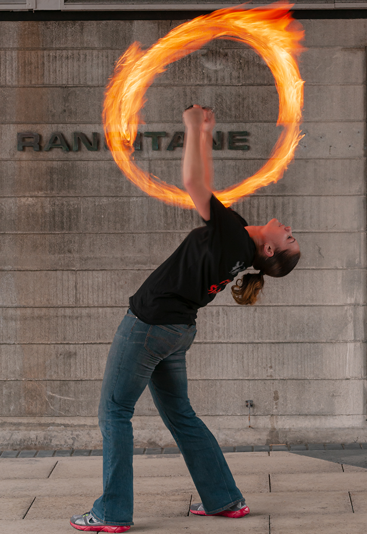 | A | Fire Spinner Renee | merit | Both Renee and the photographer are showing skill in this image. The shutter speed is well chosen for capturing the burning circle and yet our character is sharp. The background is relatively clear of detail which isolates her well, but it also gives us little information to give us context. The subject feels very tight within the edges of the frame, which gives the subject a cramped feeling. | |