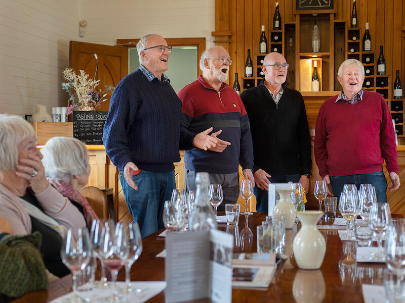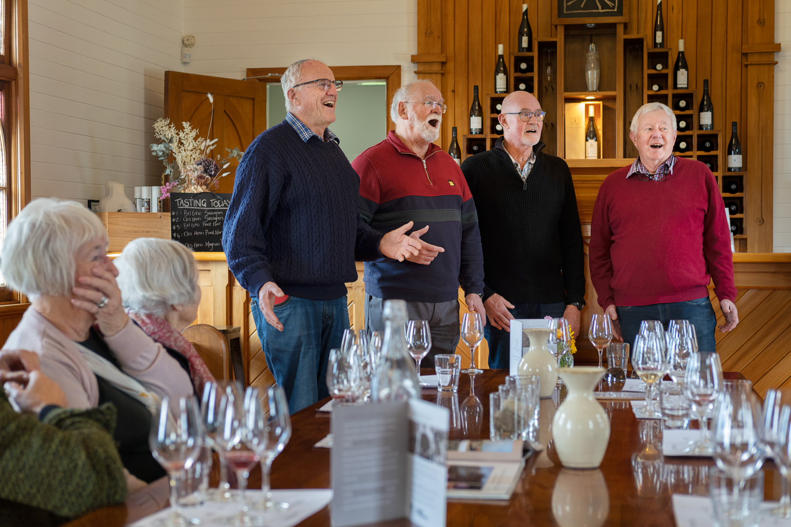 | A | The Entertainers | merit | One could perhaps be forgiven thinking that the empty glasses have helped to lubricate the vocal cords! The story is told well, the moment captured in full voice is well timed. Every element adds to the story, although the background is in full focus, and this adds to the business in the frame. | |