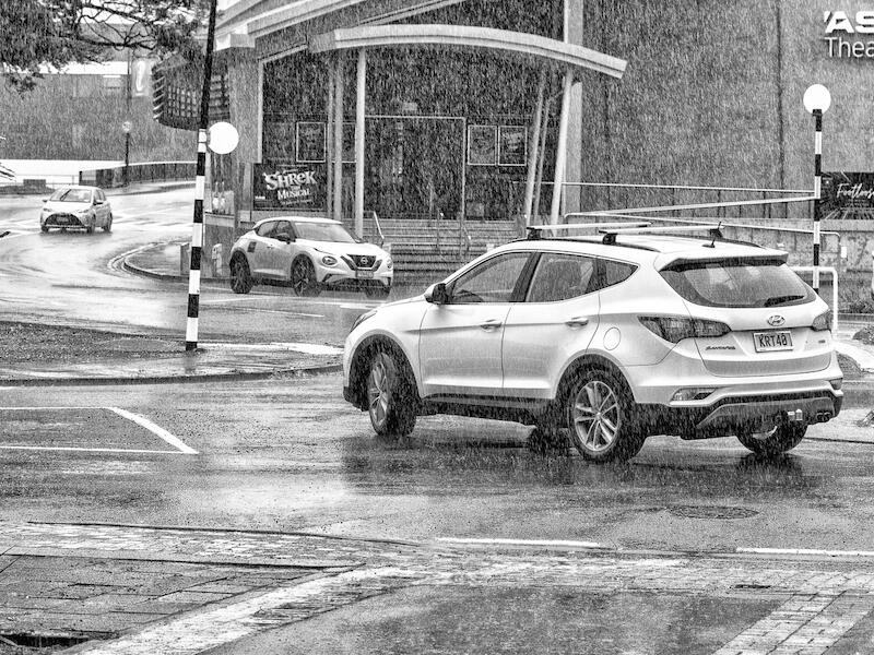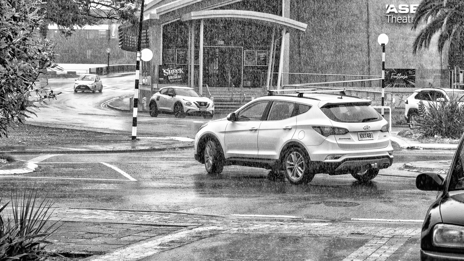 Creative composition of a busy scene but tells a rainy story with the mono treatment highlighting the rain pouring down. Even that car on the right-hand side adds to the story.