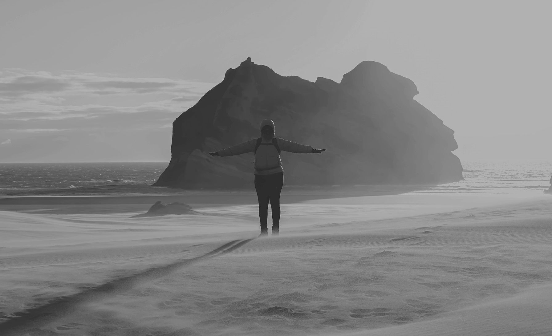 I’ve been on that beach! Great dramatic weather with the sand and wind blowing, I can almost feel the sand stinging my legs. The mono effect works well. Could consider a crop right of the rock. The light while adding to the story, may be little intense.